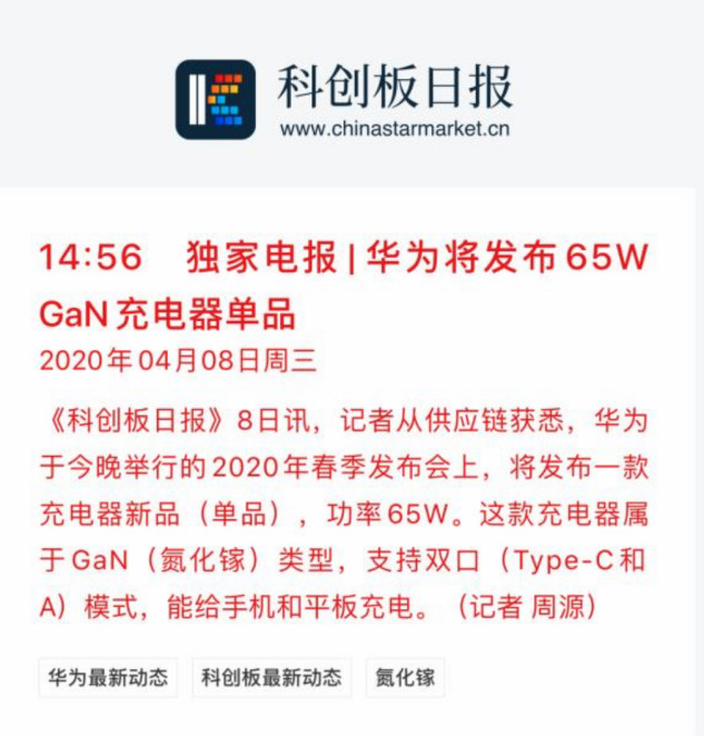 华为于昨晚举行的2020年春季发布会上,发布了一款充电器新品(单品),功率65w。这款充电器属于GaN(氮化镓)类型,支持双口(Type-C和A)模式,能给手机和平板充电。在这则新闻发布之后,读者对华为在这个充电头里面